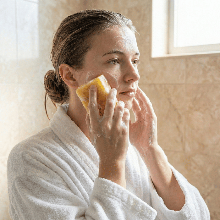 Der integrierte Schwamm sorgt für ein sanftes Peeling, entfernt abgestorbene Hautschüppchen und fördert eine glattere, frischere Hautoberfläche – ganz ohne zusätzliche Produkte.